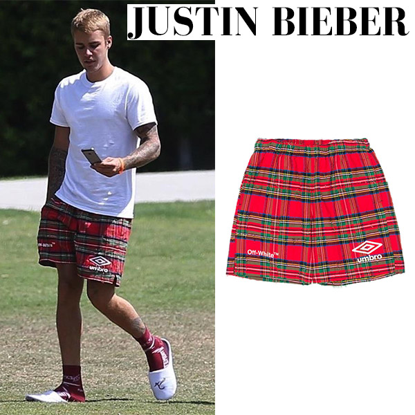 Justin Bieber in red check Umbro shorts red umbro shorts